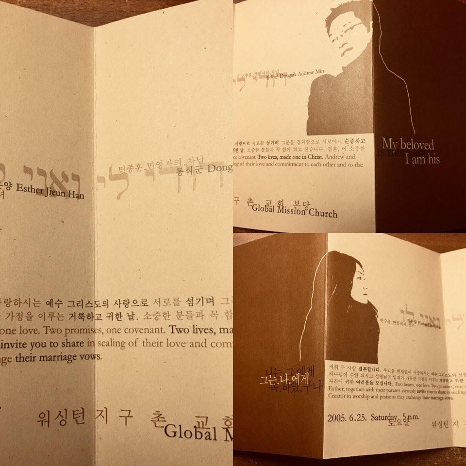 아가서 묵상 둘째 날 저녁. 다바오를 떠나는 친구 선교사에게 쓸 카드를 찾다가 우연히 14년된 우리 부부 청첩장을 찾았다. 이걸 여기까지 들고 왔었네. ㅎㅎㅎ 그래픽 디자이너이신 시아주버님이 결혼 선물로 직접 디자인해주신 세상에 하나밖에 없는 청첩장이다. 그때 우리가 부탁했던 theme이 아가서였었다! 결혼반지에도 오늘 묵상 본문에 포함된 아가서 구절이 히브리어로 engraved 되어 있고 (지금은 살쪄서 못 끼는 결혼반지!!!!), 결혼식 때 신부 행진곡도 "나의 사랑하는 자의 목소리(기타 연주로 들어보자: https://www.youtube.com/watch?v=bd00sdxnoJ0)"였었는데... 이걸 다 잊어버리고 있었다니... 기억력 하고는.. ㅋ