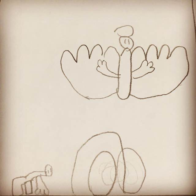 유치원에서 남는 시간에 그렸는지, 이 그림을 그려서 들고 온 A. 예수님의 가시면류관, 뒤를 따르는 한 여인, 십자가, 무덤의 열린 돌문과 천사. 상당히 디테일하다. Easter break 기간에 아이들과 예수님에 대한 애니메이션을 봤었는데, 그 기억으로 그린 듯하다.