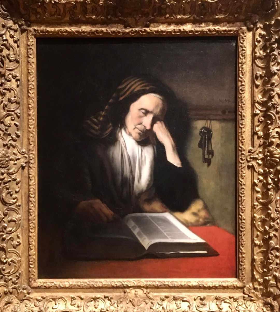 어두운 방에 지긋하게 나이가 드신 여성 한 분이 보인다. 손등에 머리를 기댄 채 책을 읽다가 졸고 있다 (생각에 잠겨 있다고 볼 수 있지만, 그림의 전체적인 분위기는 조금 foggy 한 느낌이라...).
